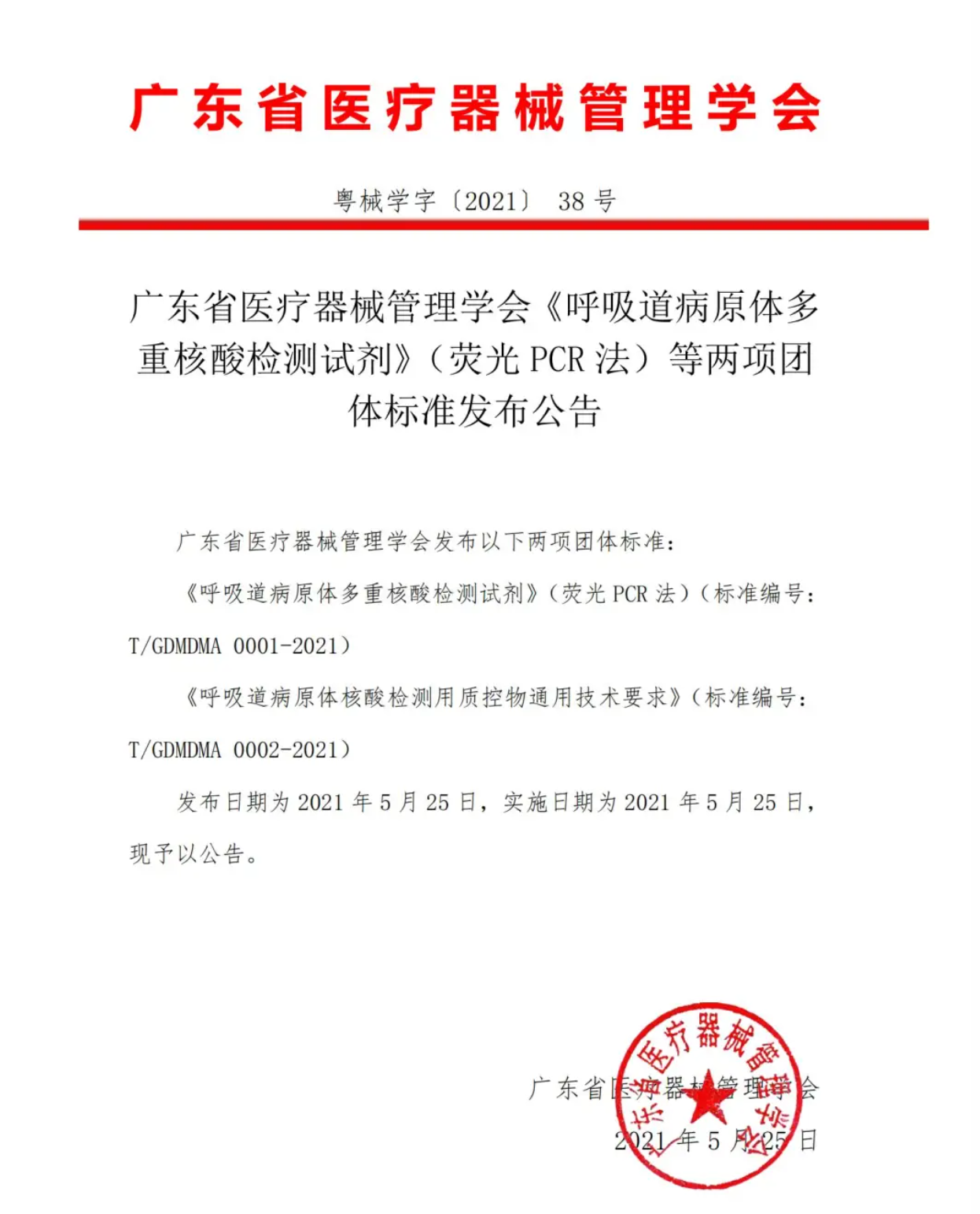广东省医疗器械管理学会《呼吸道病原体多重核酸检测试剂》(荧光PCR法)等两项团体标准发布公告